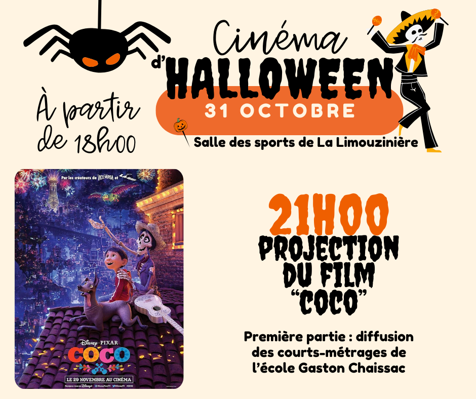 Ensuite, à partir de 21h, place au grand moment cinéma ! La soirée commencera avec la diffusion des courts-métrages réalisés par les élèves de l’école Gaston Chaissac, suivie de la projection du film Coco. Ce chef-d’œuvre d’animation vous emmènera au cœur du Dia de los Muertos, une célébration colorée, émotive et pleine de magie.