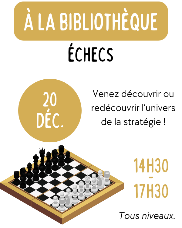Venez jouer aux échecs à la bibliothèque ! Vous pourrez découvrir ou redécouvrir l’univers de la stratégie. Pour tous niveaux.