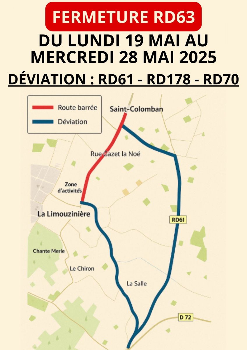 Dans le cadre de travaux sur la voirie, la circulation sera interdite sur la route départementale 63 entre La Limouzinière et Saint-Colomban, à partir de la rue Gazet la Noé, du lundi 19 mai au mercredi 28 mai 2025.