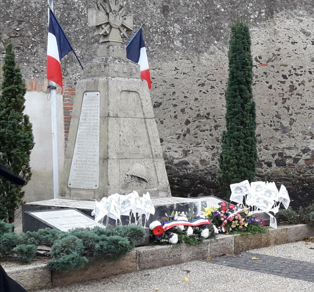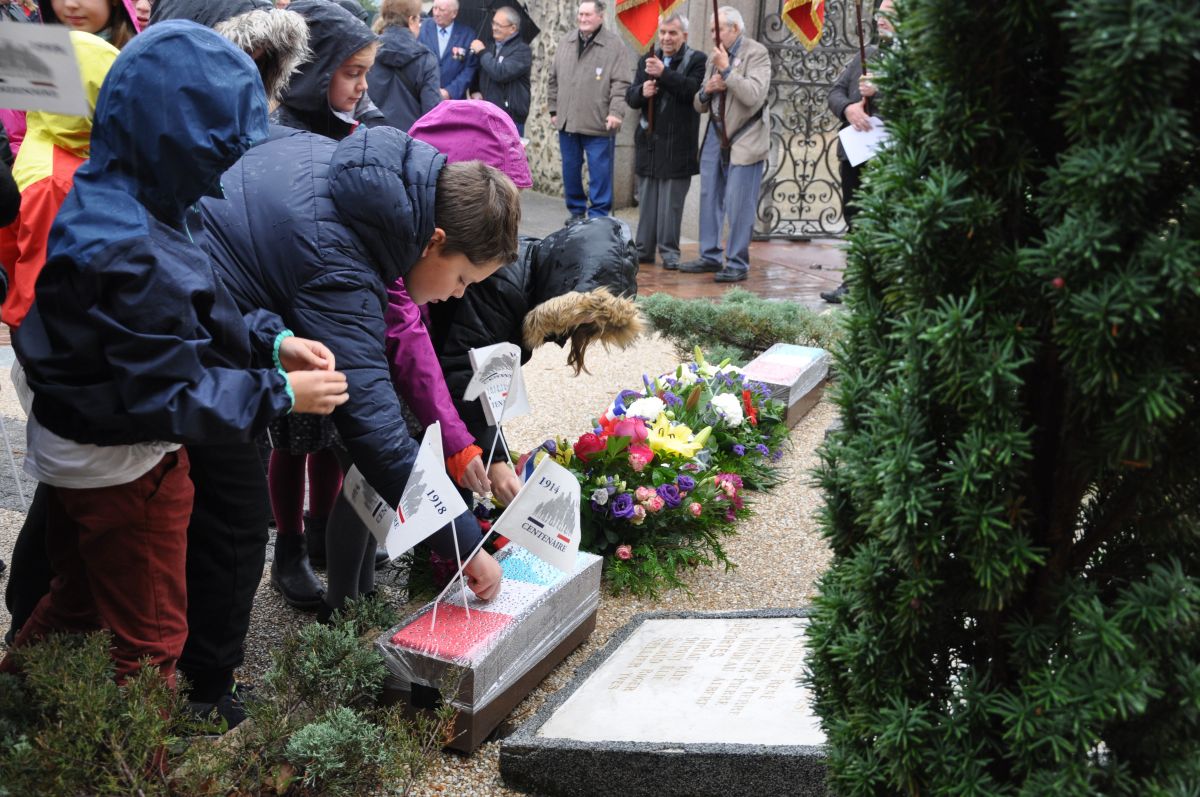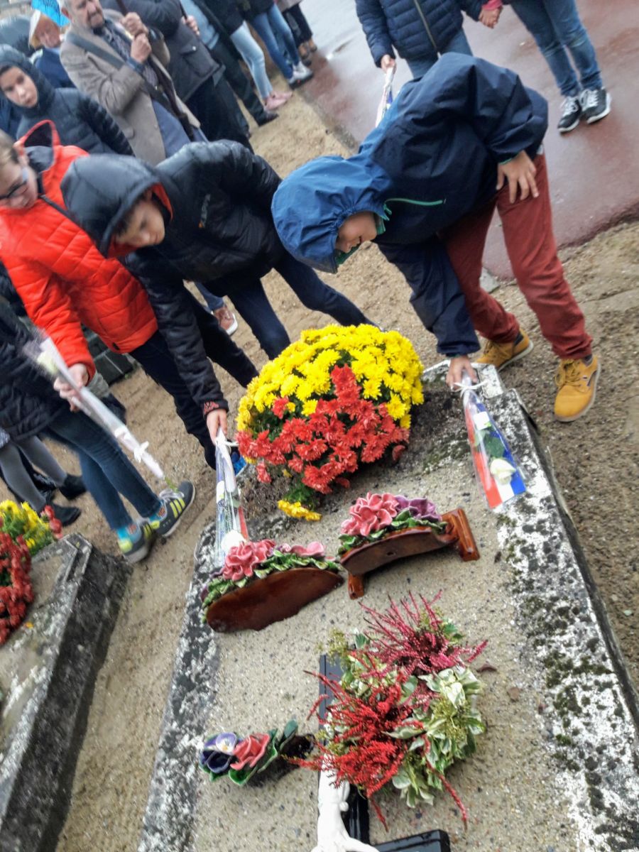 Après un temps de recueillement et de prières au cimetière, les enfants ont déposé une rose blanche sur les tombes des soldats morts pour le pays. Ces 13 tombes étaient bien reconnaissables car la municipalité y avait fait apposer de nouvelles plaques tricolores permettant d’identifier les combattants.