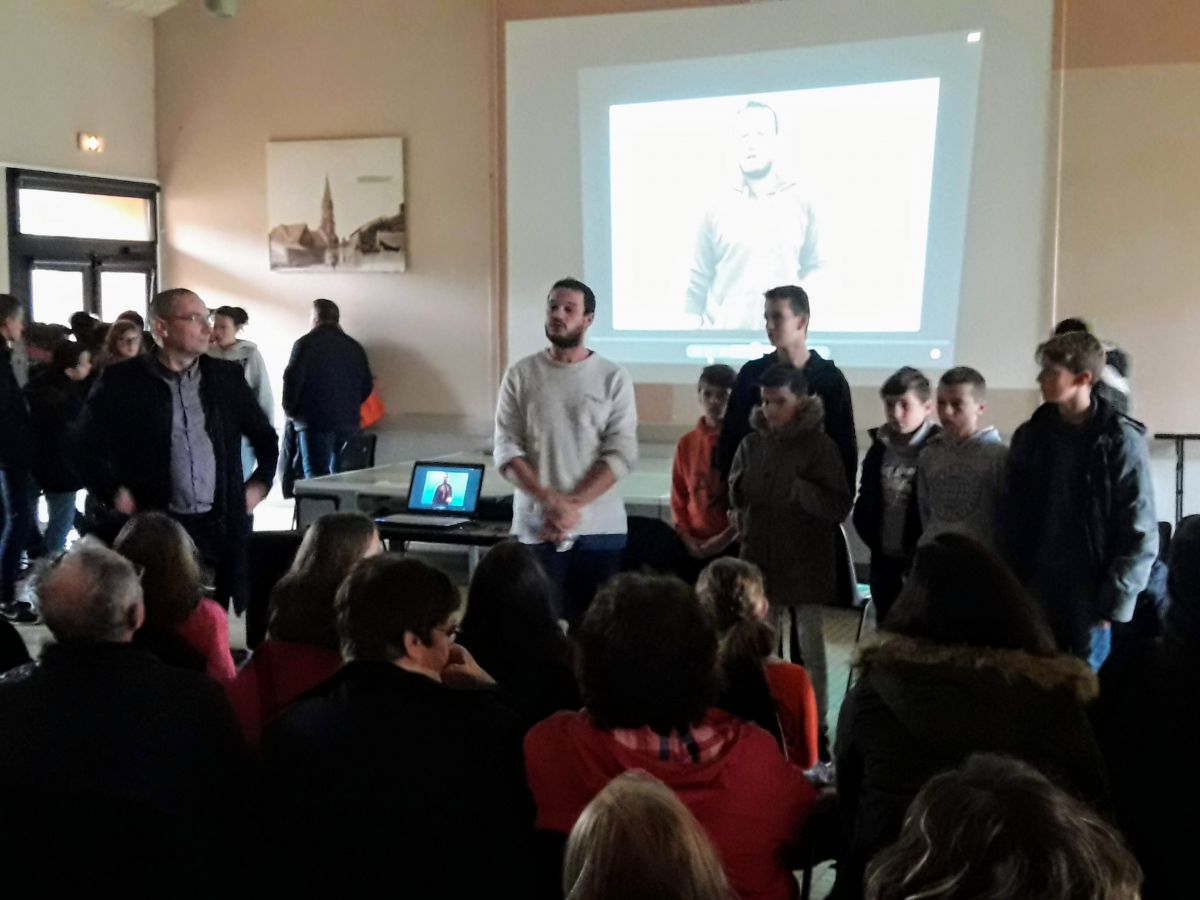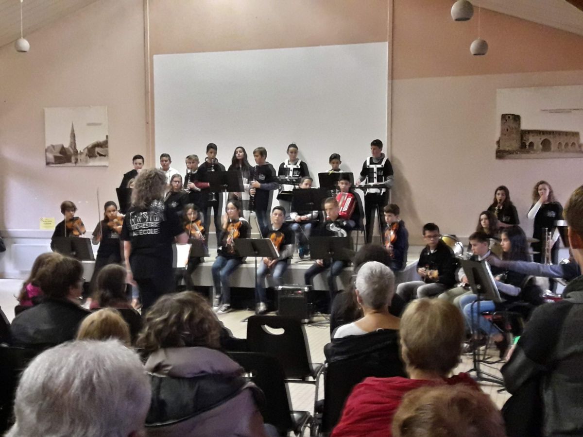 La commémoration s’est poursuivie à la salle Henri IV. 35 élèves du collège Lamoricière de Saint Philbert de Grand lieu, accompagnés de leur professeur de musique, Madame Béliard, ont fait une représentation instrumentale. Différents morceaux ainsi que la Marseillaise ont honoré nos combattants.
