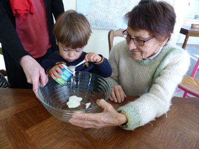 Chaque rencontre s’appuie sur une activité réalisable et/ou connue de tous (confection de gâteaux, ateliers manuels, chants, balades)…afin qu’elle présente un intérêt pour chacun d’entre eux tant sur le plan de la motricité, que sur l’éveil et le développement de l’enfant que sur le maintien de l’autonomie et de la socialisation quelle que soit la dépendance du résident.