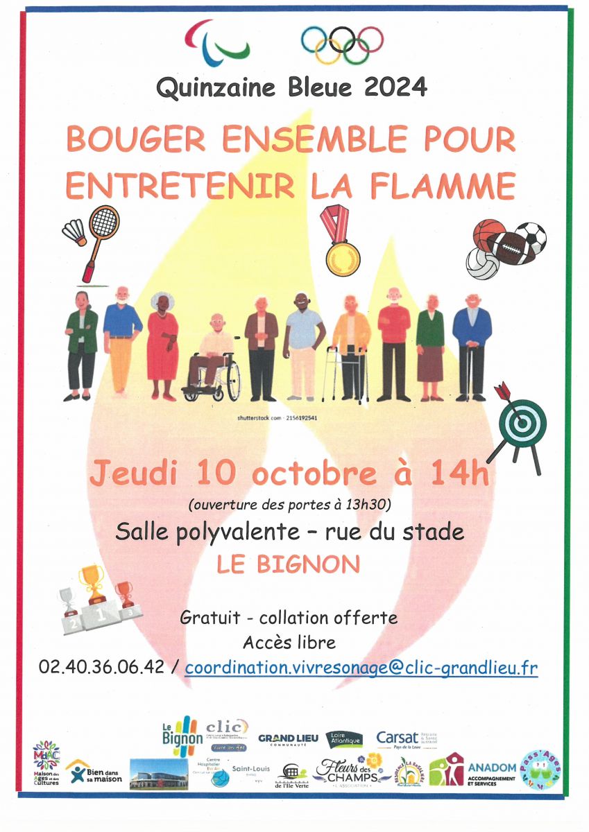 Dans le cadre des jeux olympiques nous vous invitons à : « Bouger ensemble pour entretenir la flamme ». Au programme un tournoi mêlant activités et jeux pour tous (jeux en bois, boccia, danse assise, jeux de ballon,…) ! Venez profiter d’un moment convivial et festif ! La participation est libre ! Nous vous invitons à venir vêtu d’un vêtement ou d’un accessoire d’une des couleurs des anneaux des jeux olympiques (rouge, bleu, jaune, vert ou noir). Les festivités auront lieu à la salle polyvalente, rue du stade, sur la commune du Bignon le jeudi 10 octobre 2024 à partir de 13h30 jusqu’à 16h30. Début des activités à 14h. Tous les habitants de plus de 60 ans de Grand Lieu Communauté sont conviés à ce moment de partage (évènement financé et gratuit pour tous – sans inscription – 02 40 36 06 42 – collation offerte)
